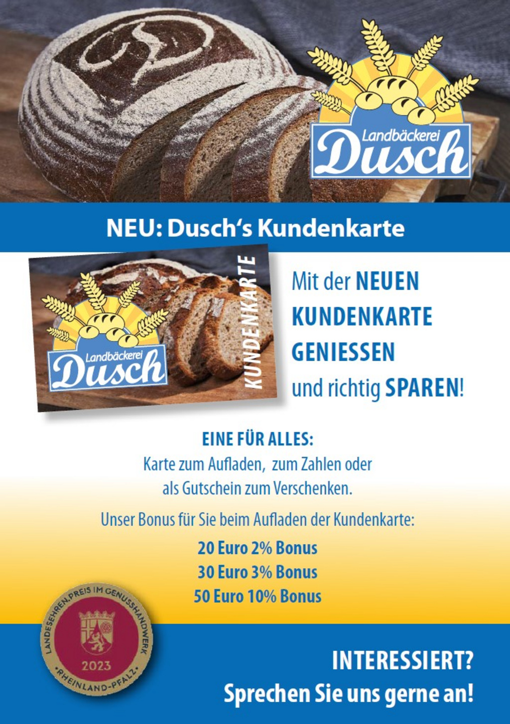 Schicken Sie die defekte registrierte Karte mit Ihrer Adresse und Ihrer Telefonnummer an Landbäckerei Dusch GmbH, Hauptstraße 64a, 66879 Reichenbach-Steegen oder geben Sie diese mit den oben genannten Informationen, bestenfalls in einem Umschlag, in einem unserer Filialen zur Wiederherstellung ab. Nach nur 5 - 7 Werktagen erhalten Sie eine neue Karte, auf welche Ihr Guthaben und die gesammelten Brotkäufe übertragen wurden.